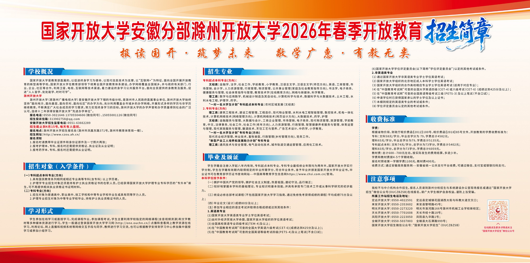 国家开放大学2026年春季招生开始报名,请有报名意向的同志携带身份证原件、毕业证书原件、两张一寸照片到滁州市凤凰东路371号(市教育体育局一楼)滁州开放大学招生报名处现场报名,咨询电话:13705504606,15055001126,报名截止到2026年4月15日,上午8:30--11:30,下午:2:30--5:30.